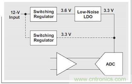 極大降低係統功耗的一種方法是對高速數據轉換器的電源進行優化。數據轉換器 設計和工藝技術的一些最新進展,讓許多新型 ADC 可以直接由開關電源來驅 動,從而達到最大化功效的目的。 係統設計人員們習慣在開關穩壓器和 ADC 之間使用一些低噪、低壓降穩壓器 (LDO),以清除輸出噪聲和開關頻率諧波(請參見圖 1)。但是,這種幹淨的電 源設計的代價是高功耗,因為 LDO 要求壓降餘量來維持正常的運行。最低壓降 一般為 200 到 500mV,但在一些係統中其可以高達 1 到 2V(例如,ADC 的3.3-V 電壓軌產生自一個使用 LDO 的 5V 開關電源時)。