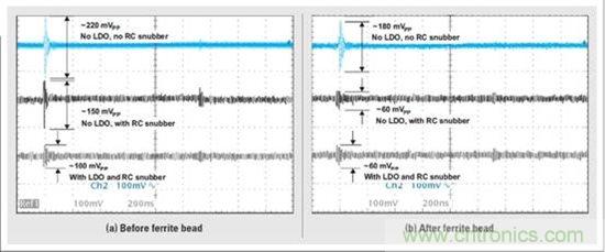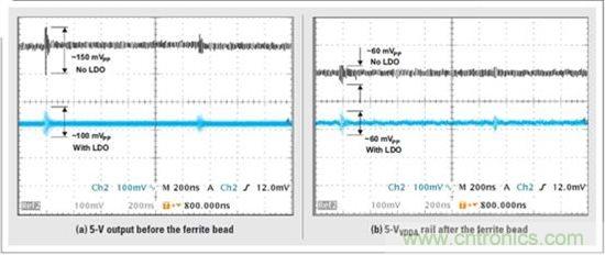 實驗 3—使用 TPS5420,從 10-V 實驗室電源生成一個 5-V 電壓軌。本實驗中, 我們繞過了 TPS79501 低噪聲 LDO。圖 3a 表明,如“實驗 2”連接的 LDO 較 好地減少了開關穩壓器的 5.3-V 輸出峰值電壓。但是,圖 3b 表明 5-VVDDA 電壓軌鐵氧體磁珠之後輸出沒有巨大的差異。