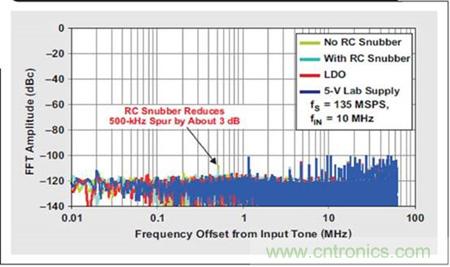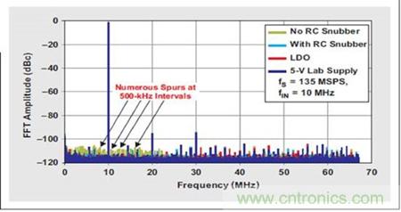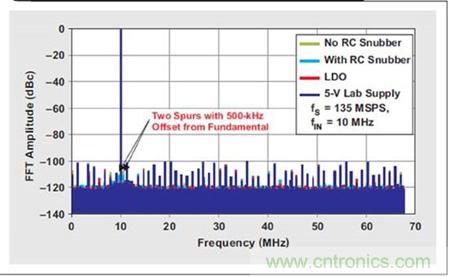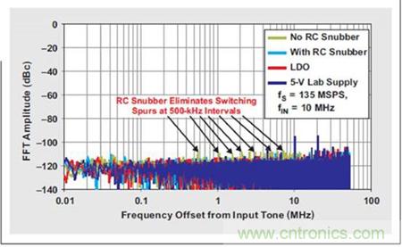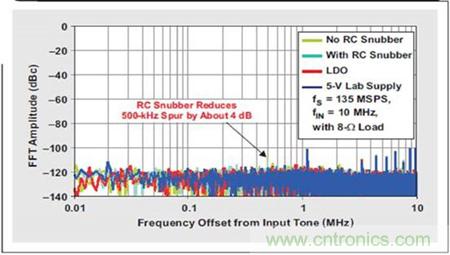 5 個實驗的 FFT 曲線圖對比(請參見圖 6)顯示噪聲底限或雜散振幅沒有出現 較大的增加。使用 LDO 清除開關噪聲使得輸出頻譜看起來幾乎與幹淨 5-V 實 驗室電源完全一樣。去除 LDO 以後,我們觀測到從開關穩壓器產生了兩個雜散, 其具有一個來自 10-MHz 輸入音調的約 500 kHz 頻率偏置。RC 緩衝器電路降 低這些雜散振幅 約 3dB,從約 –108 dBc 降到了約 –111 dBc。這一值低於 ADS5483 的平均雜散振幅,其表明 ADS5483 可以在不犧牲 SNR 或 SFDR 性 能的情況下直接由一個開關穩壓器來驅動。