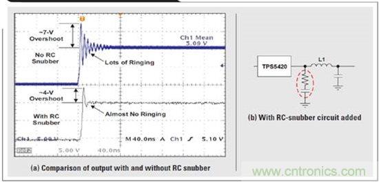 RC 緩衝器 降壓穩壓器輸出能夠以相當高的開關速度對非常大的電壓實施開關操作。本文 中,將 TPS5420 的輸入電壓軌設定為 10V,我們可以在輸出端觀測到許多過衝 和振鈴,如圖 7a 所示。為了吸收一些電源電路電抗能量,我們將 RC 緩衝電 路添加到了 TPS5420 的輸出(請參見圖 7b)。