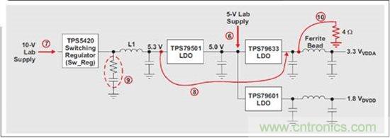 實驗 6—將一個 5-V 實驗室電源連接到兩個低噪聲 LDO(一個使用 3.3-V 輸 出,另一個使用 1.8-V 輸出)的輸入。LDO 並未給實驗室電源帶來任何有影響 的噪聲。實驗 7—將一個 10-V 實驗室電源連 接到 TPS5420 降壓穩壓器,其與 一個5.3-V 輸出連接,像“實驗 2”連接 ADS5483 一樣。TPS79501 生成了一個過濾後的 5.0-V 電壓軌,其向 3.3-V 輸出和 1.8-V 輸出 LDO 提供輸入,如圖 10所示。 實驗 8—所有 3.3-VVDDA 電壓軌 LDO 均被繞過。TPS5420 配置為一個 3.3-V 輸出,該輸出直接連接到 3.3-VVDDA 電壓軌。TPS79601 生成 1.8-VDVDD 電壓軌, 並通過一個外部 5-V 實驗室電源供電。
