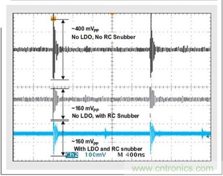 圖 11 顯示了“實驗 7”、“實驗 8”和“實驗 9”產生的一些 3.3-VVDDA 輸出波 形。有或無 LDO 的峰值電壓振幅存在一些差異,但 RC 緩衝器可降低 60% 的 峰值噪聲。