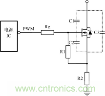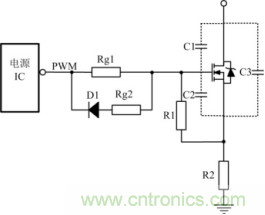 電源ICzhijiequdongshiwomenzuichangyongdequdongfangshi,tongshiyeshizuijiandandequdongfangshi,shiyongzhezhongqudongfangshi,yinggaizhuyijigecanshuyijizhexiecanshudeyingxiang。diyi,zhakanyixiadianyuanIC手冊,其最大驅動峰值電流,因為不同芯片,驅動能力很多時候是不一樣的。第二,了解一下MOSFET的寄生電容,如圖1中C1、C2的值。如果C1、C2的值比較大,MOS管導通的需要的能量就比較大,如果電源IC沒有比較大的驅動峰值電流,那麼管子導通的速度就比較慢。如果驅動能力不足,上升沿可能出現高頻振蕩,即使把圖 1中Rg減小,也不能解決問題!IC驅動能力、MOS寄生電容大小、MOS管開關速度等因素,都影響驅動電阻阻值的選擇,所以Rg並不能無限減小。
