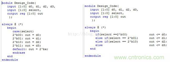 設計一個二位4路選擇器,由於選擇器使用條件觸發的方法對應真值表進行匹配輸出與輸入,因此可以聯想到在C程序設計中的條件語句“If”和“Case”兩種,那麼這兩種設計從硬件的角度出發有什麼不同呢?