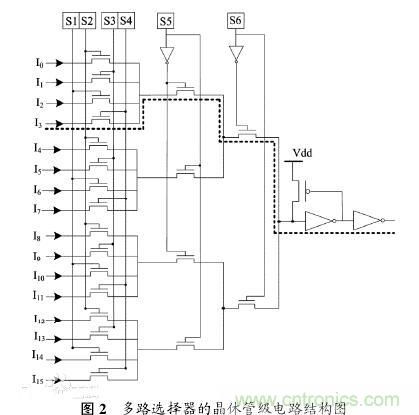 多路選擇器的左邊是 16 條輸入線,用於連接布線軌道或可編程邏輯塊等資源,S1~S6 代表 6 個可編程SRAM 單元,通過配置 SRAM 單元的內容可以從 16條輸入線中選出 1 條作為有效輸入端,例如,當 S1~S6存儲單元的存儲值為“000100”時,輸入線 I3被選擇中,信號所經過的有效路徑如圖 2 中虛線所示。多路選擇器的主體部分是傳輸晶體管,由於 NMOS 晶體管載流子的遷移效率高,電路速度快,因此,多路選擇器中的傳輸晶體管均采用 NMOS 晶體管實現。