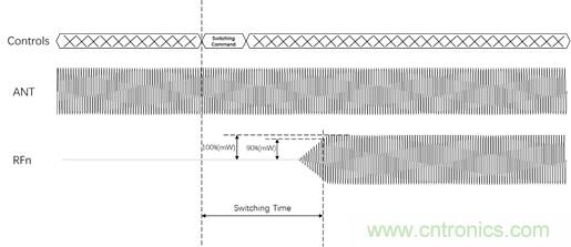 開關時間(Switch Time)或切換時間指的是開關從“導通”狀態轉變為“截止”狀態或者從“截止”狀態轉變為“導通”狀態所需要的時間。具體來講是指從DUT接收到通道切換命令,到在被切換到的通道上信號的功率達到滿幅度值的90%的時間。