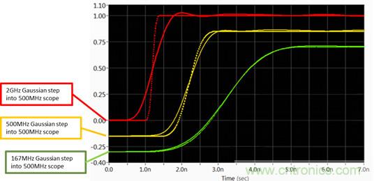 圖2:500MHz帶寬示波器對於不同階躍響應的曲線