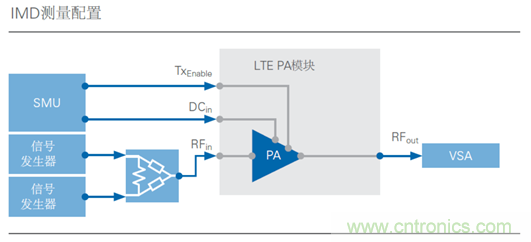 根據IMD測量理論,執行該測量需要雙音激勵信號。在大多數應用中,配置雙音激勵信號的首選方法是將RF信號發生器連接至RF功率組合器,如圖13 所示。