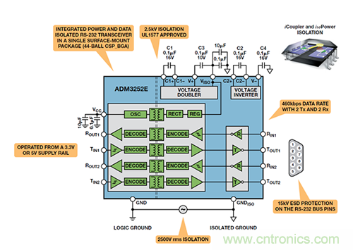 ADM3252E即是這樣的一個例子,它是一個緊湊器件中的隔離式雙通道RS-232 收發器。iCoupler隔離技術至少在以下五個方麵克服了舊式光耦合器解決方案所造成的限製:集成(由於iCoupler支持雙向操作,因此可縮小總體尺寸並降低係統成本)、性能更高、功耗更低、易於使用且可靠性更高。