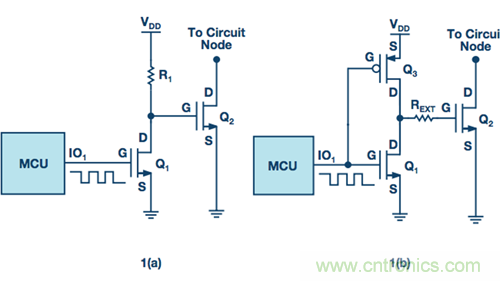 考慮一個具有微控製器的數字邏輯係統,其I/O引腳之一上可以輸出一個0 V至5 V的PWM信號。這種PWM將不足以使電源係統中使用的功率器件完全導通,因為功率器件的驅動電壓一般超過標準CMOS/TTL邏輯電壓。因此,邏輯/控製電路和高功率器件之間需要一個接口。這可以通過驅動一個邏輯電平n溝道MOSFET,其進而驅動一個功率MOSFET來實現,如圖1a所示。