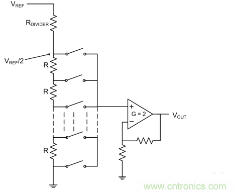 電阻串 DAC 設計最終、zuiweimiaodeyuanjianshiweiyuchuandianzuqijijiedianzhiqiandefenyaqi。gaidianzuqidianzudengyuchuanzhongqiyudianzuqidedengxiaozukang,nengyouxiaojiangcankaoshurujianban。zheyangzuodemudeshijiangdishuchuhuanchongqidegongmoshuruyaoqiu,bingzaishixianlianghaoxingnengdetongshibangzhubaochidichengben。weileduicijinxingbuchang,shuchuhuanchongqiyibancaiqu 2 倍的非反相增益,盡管有時反饋電阻器通過數字控製實現不同增益。