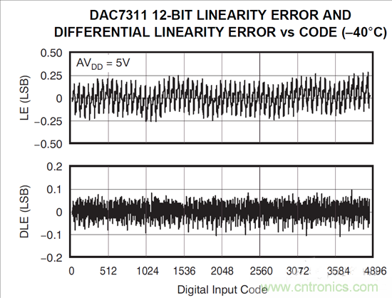 meigedianzuqizhidejingquedukezhijiejuedingxianxingdu。ruguodianzuchuanzhongrenheyigedianzuqidezhibuheshi,womenjiuhuizaidaimazhuanhuanshifaxianxiangduiyugaidianzuqidebuliangweifenfeixianxingdu (DNL)。此外,所有後續代碼的積分非線性度 (INL) 也會因為不匹配而產生失調。由於典型電阻串 DAC 設計中的電阻器數量龐大,我們不可能對每個電阻器都進行調整,因此隻能接受一定程度上的 DNL 誤差。然而,仍然必須維持良好的 INL 性能,因此可經常對各組電阻器實施區域化調整,以避免調整每個電阻器,其在以下 INL 圖中呈“階梯”狀。