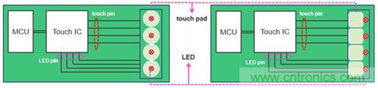 從LED驅動的角度,比較二者的異同。通常,觸控 IC內置了LED Driver。如果應用方案中需要使用LED表示觸控動作的有/無,並且應用產品的結構設計,要求LED緊鄰觸控電極,如圖5所示,那麼使用觸控 IC更方便PCB的Layout。