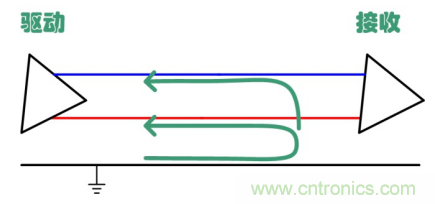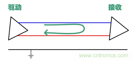 先介紹共模幹擾,圖 1、圖 2分別給出了差模和共模幹擾及其傳輸路徑。圖中的驅動器及接收器為差分信號傳輸,類似CAN總線。差模幹擾產生於兩條傳輸線之間,共模幹擾則在兩條線中同時產生,其電勢是以地為參考。