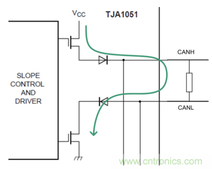 CAN收發器內部CANH、CANL分別為開源,開漏輸出形式,驅動電路如圖 3所示。這種方式可以使總線輕鬆實現顯性電平的驅動,而隱性電平則通過終端電阻放電來實現。