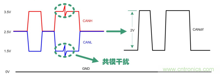 總線固有的差分傳輸形式使得CAN對於共模幹擾有很好的抑製能力,如圖 4所示,通過CANH、CANL相減可很好地消除來自外部的共模幹擾,但CANH、CANL並非理想對稱,快速上升的跳變沿,這些均會帶來EMC問題。我們通過示波器看總線波形很完美,測試靜電,EFT,浪湧,傳導騷擾抗擾均無異常。但測試傳導發射,則不能滿足限值要求,看起來很正常的總線實際卻向外在發送傳導幹擾。