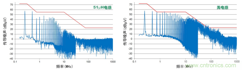 對於CAN接口的EMC問題,除了選用更好性能,符號要求的CAN收發芯片,另一種簡單的方法就是對CAN接口增加外圍,共模電感是一種很好的選擇。在現有汽車電子CISPR 25標準中,對傳導騷擾限值有很嚴格要求。許多CAN收發器均會超過限值。如圖 5分別為按照車規限製測試增加和不加共模電感的CAN接口傳導騷擾,共模電感值為51μH,可以看到在各個頻段下對噪聲改善較為明顯,測試結果仍有很大裕量。