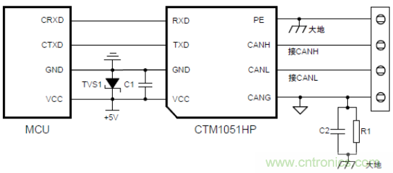 ZLG致遠電子基於多年的總線防護設計積累推出了高防護等級隔離模塊——CTM1051(A)HP係列。該係列符合國際ISO11898-2標準,靜電防護等級可達接觸±8kV,空氣放電±15kV,浪湧防護可達±4kV隔離CAN解決方案,具體如下圖7所示,能夠適用於各種惡劣的工業現場環境。應用簡便,即插即用,應用原理圖如下圖8所示。