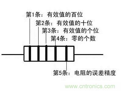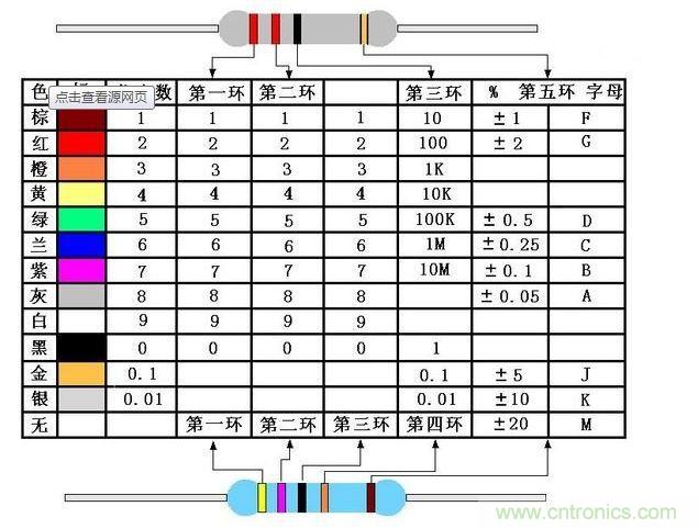 電dian阻zu器qi上shang用yong不bu同tong顏yan色se的de環huan來lai表biao示shi電dian阻zu的de標biao稱cheng阻zu值zhi,常chang見jian的de電dian阻zu器qi有you四si色se環huan電dian阻zu和he五wu色se環huan電dian阻zu。四si色se環huan電dian阻zu,一yi般ban是shi碳tan膜mo電dian阻zu,用yong三san個ge色se環huan來lai表biao示shi阻zu值zhi,用yong一yi個ge色se環huan表biao示shi誤wu差cha。五wu環huan電dian阻zu一yi般ban是shi金jin屬shu膜mo電dian阻zu,精jing度du更geng高gao,常chang用yong四si個ge色se環huan表biao示shi阻zu值zhi,另ling一yi個ge色se環huan表biao示shi誤wu差cha。