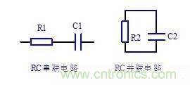 電路中電阻與電容組合在一起的電路稱為RC電路,圖中R1和C1構成了RC串聯電路,R2和C2構成了RC並聯電路。