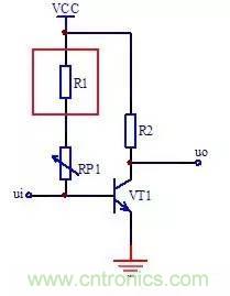 電阻R1用來限製電路中電流,防止可變電阻器阻值調到最小時,使得三極管VT1基極電壓等於電源電壓VCC,那樣會因為VT1基極電流太大而損壞VT1,這種電阻在電路中一般稱為保護電阻。