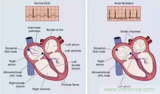 這種心律失常稱之為心房顫動(AFibrilation,AFibrilation,房顫),這是左心房和/或右心房(即心髒兩個上腔)的正常心跳異常。AFib會破壞心房和心室(即心髒的兩個下腔)之間的正常血流,並增加四至五倍中風的風險,因為它更容易形成血栓。事實上,AFib在血管裏由凝塊或脂肪斑塊沉積引起的缺血性中風中占的比例達到15-20%。僅在美國,就有270萬和610萬人估計有AFib,預計這一數字隨著美國人口老齡化而增加,因為約2%的65歲以下的人和約9%的65歲以上的或更老的人患有AFib。