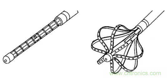 一種電生理學導管,在心髒中可展開和伸縮,具有64個電極。
