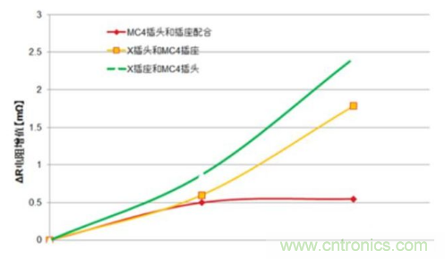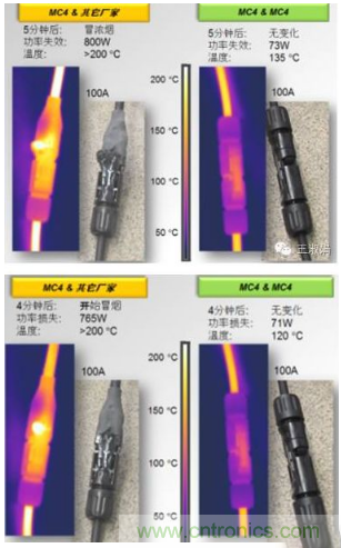 而與之形成鮮明對比的是MC4自身公母頭插合後的測試結果:除了溫度有初始的90℃升高到135℃及功率損失由69W升高到73W外,外觀並無明顯的變化。
