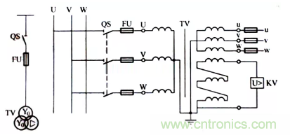 當dang係xi統tong中zhong發fa生sheng單dan相xiang接jie地di故gu障zhang時shi,係xi統tong中zhong會hui出chu現xian零ling序xu電dian流liu。如ru果guo一yi次ci側ce中zhong性xing點dian沒mei有you接jie地di,那na麼me一yi次ci側ce就jiu沒mei有you零ling序xu電dian流liu通tong路lu,二er次ci側ce開kai口kou三san角jiao形xing線xian圈quan兩liang端duan也ye就jiu不bu會hui感gan應ying出chu零ling序xu電dian壓ya,繼ji電dian器qiKV就不會動作,發不出接地信號;對於三相五柱式電壓互感器,其一次側中性點同樣要接地;由兩隻單相電壓互感器組成的V-V形接線時,其一次側是不允許接地的,因為這相當於係統的一相直接接地。而應在二次中性點接地,如圖1所示。