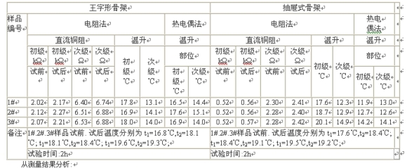 b.采用王字形骨架的變壓器用熱電偶法和電阻法測出的變壓器溫升非常接近。