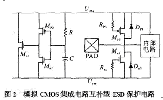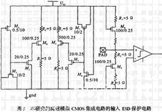 數字電路一般采用兩級保護電路,並且在主保護電路和次保護電路中串聯一個限流電阻,而大的限流電阻和ESD 鉗位器件的節電容會產生一個大的RC 延遲,因此,不適合應用於高速模擬CMOS集成電路中。