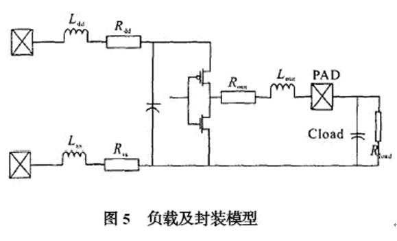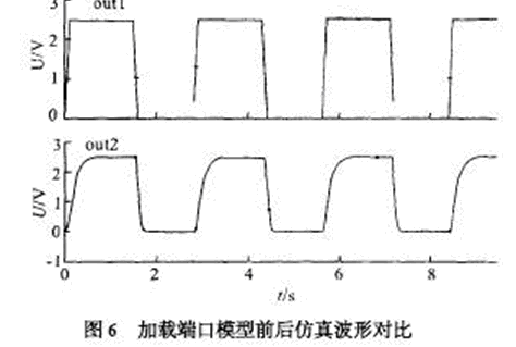 由於ESD baohudianluyijifengzhuangsuodailaidejishengdianronghejishengdianganduiyuanyoushuchuxinhaohuiyouyingxiang,youqishizaigaosumonidianluzhong,pinlvyuegaoxinhaojibianyueyanzhong,suoyijianliheshidefangzhenmoxingbingjinxingyouxiaodefangzhenshibixude。xinhaoyibanjingguoqudong, ESD 保護,和封裝引線才能傳到芯片外的負載上,封裝的模型根據選用的封裝形式和廠家提供的參數決定。 一般IC 封裝會給出端口的寄生電容,電阻和電感,其等效模型如圖5所示。 將該模型與前麵的ESD 保護電路(圖3) 串連起來就可以得到端口模型, 可用spice 對用於USB2.0 的環境,在480 MHz 頻率下的收發電路進行仿真,其仿真波形如圖6 所示。 輸出端口out1 是不考慮端口模型的影響,480 MHz 時鍾的輸出較為理想,out2 是加入端口模型後的時鍾輸出,波形有所畸變,但仍能滿足電路設計要求。