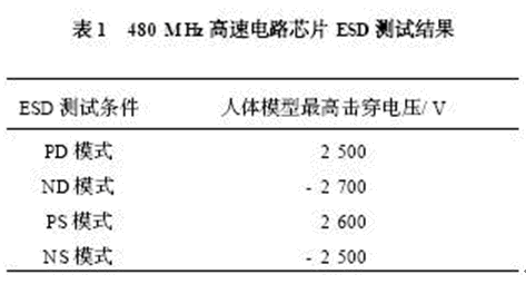 上述ESD 保護電路(見圖3) 在被應用於設計USB2. 0 接口芯片中。 該芯片的最高時鍾頻率為480 MHz ,采用TSMC 公司的0. 25μm 混合信號工藝進行了流片。 流片後的芯片用抗靜電測試儀( Thermo Keytek 公司,型號: ZAPMASTER 714)進行了測試,其結果如表1 所示,給出了在上述4 種不同的放電模式下的耐壓值。 測試結果表明在所有測試條件下的人體模型最高擊穿電壓(V) 超過了正負2 500 V。