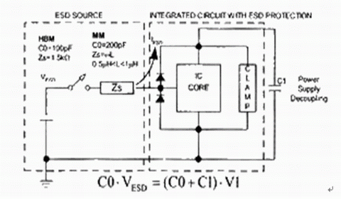ESD電平用電壓描述,這個電壓源幹與IC相連的電容上的儲存電荷。一般不會考慮有上千伏的電壓作用於IC。為了評估傳遞給IC的能量,需要一個模擬放電模型的測試裝置。