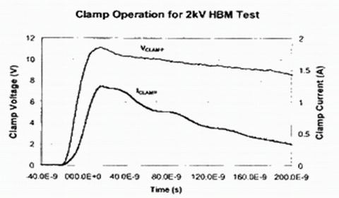 大電流在ESD二極管和引線上產生I-R壓降,該電壓高於二極管本身的壓降。IC可靠性報告中給出了器件設計所能承受的ESD測試電壓。