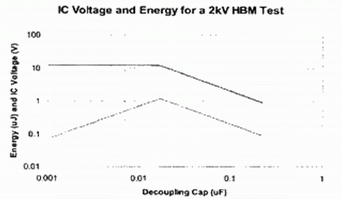 對於一個給定的去耦電容,ESD測試中初始電壓的變化遵循電荷守恒。例如,使用一個0.01μF去耦電容,2kV HBM測試電壓可以達到20V。