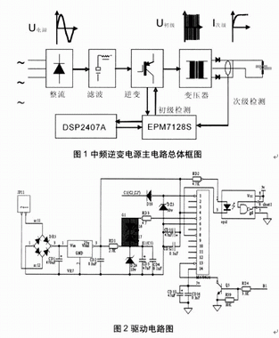 zhongpinnibianzhiliudianzuhanjidegongdiandianyuanshiyousanxianggongpinjiaoliudianyuanjingzhengliudianluhelvbodianrongzhuanhuanchengzhiliudianyuan,zaijingyougonglvkaiguanqijianzuchengdenibiandianluzhuanhuanchengzhongpinfangbodianyuan,ranhoushuru變壓器降壓後,經低管壓降的大功率二極管整流成直流電源,供給焊機的電極,對工件進行焊接(見圖1)。控製電路部分由DSP和CPLD組成,DSP(TMS320LF2407A)產生的PWM波和檢測信號、保護信號在CPLD(EPM7128S)裏現實邏輯運算。