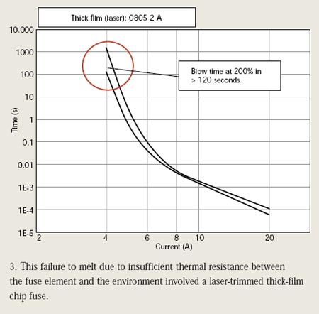 若熔斷元件和環境間的熱阻抗過低,將沒有足夠能量融化熔斷元件。這將使保險絲不能在120秒內切斷相當於額定電流兩倍的過載電流。圖2和圖3說明了多層片式保險絲以及激光調割厚膜芯片保險絲的這種情況。