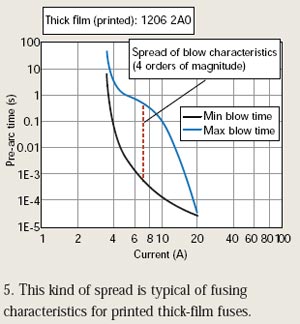 源yuan於yu這zhe種zhong阻zu值zhi變bian化hua,芯xin片pian保bao險xian絲si可ke能neng在zai正zheng常chang浪lang湧yong電dian流liu條tiao件jian下xia熔rong斷duan。或huo反fan過guo來lai說shuo,它ta也ye可ke能neng在zai過guo載zai條tiao件jian下xia需xu要yao熔rong斷duan時shi而er沒mei能neng熔rong斷duan。當dang然ran,這zhe是shi工gong程cheng師shi必bi須xu避bi免mian的de最zui壞huai情qing況kuang。圖tu5顯示了印刷厚膜保險絲熔斷特性的典型擴散。