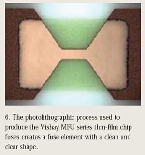 采用光刻技術,可以與控製濺射薄膜層厚度相同的準確度和精度對熔斷元件的長度和寬度施加控製。圖6顯示了如何采用光刻工藝製造Vishay的MFU係列薄膜芯片保險絲,製成的熔斷元件具有整潔和清晰的形狀。