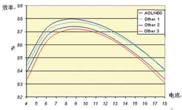 注意到圖2中,除了柵極結構,其他的部分就是標準的采用Trench工藝的MOSFET。柵(zha)極(ji)被(bei)分(fen)割(ge)成(cheng)上(shang)下(xia)兩(liang)個(ge)部(bu)分(fen),下(xia)部(bu)分(fen)用(yong)一(yi)些(xie)特(te)殊(shu)的(de)材(cai)料(liao)屏(ping)蔽(bi)起(qi)來(lai),下(xia)部(bu)分(fen)在(zai)內(nei)部(bu)和(he)上(shang)部(bu)分(fen)的(de)柵(zha)極(ji)相(xiang)連(lian),而(er)柵(zha)極(ji)的(de)屏(ping)蔽(bi)層(ceng)被(bei)連(lian)接(jie)到(dao)源(yuan)極(ji),從(cong)而(er)減(jian)小(xiao)漏(lou)極(ji)柵(zha)極(ji)米(mi)勒(le)電(dian)容(rong)。用(yong)這(zhe)種(zhong)技(ji)術(shu)設(she)計(ji)的(de)MOSFET如AOL1464,其Vds為30V,Vgs在10V條件下Rds(on)為6.2mΩ,而其Crss隻有20pF,極大地減小了開關過程中米勒平台的持續的時間,降低了開關損耗。AOL1430,其Vds為30V,Vgs在10V條件下Rds(on)為2.5mΩ,而其Crss為50pF。圖3中,下管采用AOS的AOL1428,上管采用AOL1430和其他廠家目前Crss最低的器件的效率曲線,可見,上管采用AOL1430具有非常高的效率。注意:輸入電壓12V,輸出電壓 1.7V,開關頻率300kHz。