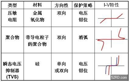 安森美半導體來自美國的ESD保護專家RobertAshton博士說,一般而言,ESD保護元件的分類可以通過其保護策略與方向性來進行,主要包括壓敏電阻、聚合物和瞬態電壓抑製器(TVS)等,如表1所示。在這幾種保護元件中,壓敏電阻在低電壓時,呈現出高電阻,其中的每個小型二極管兩端的電壓都相當低,同時電流也相當小;而在較高電壓時,其中的獨立二極管開始導通,同時壓敏電阻的電阻會下降。從表1中我們也可以看出壓敏電阻為雙向保護元件。而對於帶導電粒子的聚合物而言,在正常電壓下,這些材料擁有相當高的電阻,但當發生ESD衝擊時,導電粒子間的小間隙會成為突波音隙陣列,從而帶來低電阻路徑。