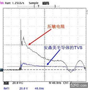 圖3的屏幕截圖就是這樣一個範例。從圖中可以看出,安森美半導體的TVS元件可以迅速將ESD應力降低,即從8kV靜電電壓鉗位到5至6V的水平;但壓敏電阻的曲線則下降得很慢,而且無法降到很低的水平。該曲線表明,TVS器件的恢複時間非常短,經過TVS器件泄漏到後麵電路的能量也非常少,特別適合於便攜式設備的應用。