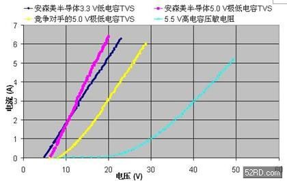 Ashton博士說在正常工作條件下,ESD保(bao)護(hu)元(yuan)件(jian)應(ying)該(gai)保(bao)持(chi)在(zai)不(bu)動(dong)作(zuo)狀(zhuang)態(tai),同(tong)時(shi)不(bu)會(hui)對(dui)電(dian)子(zi)係(xi)統(tong)的(de)功(gong)能(neng)造(zao)成(cheng)任(ren)何(he)影(ying)響(xiang),這(zhe)可(ke)以(yi)通(tong)過(guo)維(wei)持(chi)低(di)電(dian)流(liu)以(yi)及(ji)足(zu)以(yi)在(zai)特(te)定(ding)數(shu)據(ju)傳(chuan)輸(shu)速(su)率(lv)下(xia)維(wei)持(chi)數(shu)據(ju)完(wan)整(zheng)性(xing)的(de)低(di)電(dian)容(rong)值(zhi)來(lai)達(da)成(cheng)。而(er)在(zai)ESD應力衝擊或者說大電流衝擊條件下,ESD保護元件的第一個要求就是必須能夠正常工作,要有夠低的電阻以便能夠限製受保護點的電壓;其次,必須能夠快速動作,這樣才能使上升時間低於納秒的ESD衝擊上升時間。