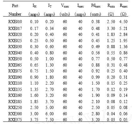 PolySwitch元件有多種係列產品,其產品特性各不相同。以常用的RXE係列元件為例,其20℃時的電氣特性如表1所示。