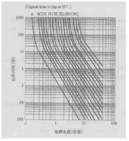 RXE係列PolySwitch元件20℃時的動作保護特性曲線見圖1。其qi中zhong橫heng坐zuo標biao表biao示shi故gu障zhang電dian流liu,單dan位wei為wei安an培pei,縱zong坐zuo標biao表biao示shi動dong作zuo時shi間jian,單dan位wei為wei秒miao。兩liang個ge坐zuo標biao軸zhou均jun為wei對dui數shu坐zuo標biao。圖tu中zhong每mei一yi條tiao曲qu線xian對dui應ying一yi個ge型xing號hao的de元yuan件jian,構gou成cheng該gai係xi列lie元yuan件jian的de動dong作zuo保bao護hu特te性xing曲qu線xian簇cu。表biao2為圖1中曲線標號與元件型號的對照表。