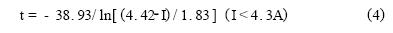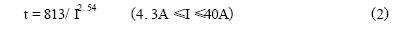 由表1可知,RXE係列PolySwitch元件所能承受的最大電流為40A。該點與臨界點之間為曲線的直線部分。設動作時間為t(秒),故障電流為I(安),考慮到橫軸、縱軸均為對數坐標,兩者之間應具有如下數學關係: