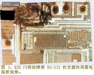 圖1示出了最近對一種頻繁失效的CMOS數據收發器IC進行的ESD閂鎖效應調查的結果:在某些情況下,IC封裝帶電,並燒毀了下麵的電路板。為了確定故障的原因,用一台記錄儀器監視電源和RS-232收發器的輸入端。記錄的波形顯示出在收發器器件的輸入端和電源腳有短時的電壓瞬變。當這些瞬變電壓迫使寄生PNPN結構導通時,就發生閂鎖效應。一旦寄生的SCR導通,SCR就jiu是shi電dian源yuan通tong過guo器qi件jian到dao地di的de一yi條tiao低di阻zu通tong路lu。在zai這zhe樣yang的de條tiao件jian下xia,通tong路lu中zhong的de電dian流liu很hen大da,從cong而er導dao致zhi器qi件jian中zhong因yin熱re過guo載zai而er熱re耗hao散san異yi常chang。過guo度du的de熱re過guo載zai會hui使shi塑su封feng外wai殼ke升sheng溫wen並bing開kai裂lie。