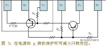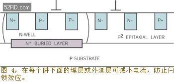 你可使用CMOS布局技術來防止閂鎖效應,因為CMOS布局技術可監控ESD瞬變會進入器件的各部位:器件的電源引腳、輸入引腳和輸出引腳。你應降低晶體管(PNP和NPN)的增益,並提高閂鎖效應的閾值,方法是加大器件結構中P溝道Tub與P溝道漏極之間的間隔。在電源和p-tub上連接p+和n+保護環也可以降低晶體管增益,提高閂鎖效應的閾值(圖3)。防止閂鎖效應的其他工藝技術有:提高阱深度以減少寄生晶體管的增益;采用絕緣襯底(如藍寶石矽)以降低tub和襯底中的電流,;在每個阱下麵采用埋層或外延層(圖4)。
