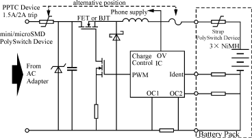 圖1是一個典型的電池充電電路。其中,交流電通過AC/DC電源適配器轉變為合適電壓對電池組進行充電。PPTC元件與過壓保護元件協調作用共同完成下列工作: